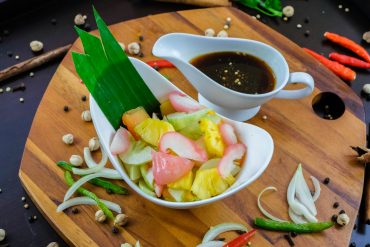 Pineapple, mango, red guava, ambrella, cucumber, yam bean, sweet & spicy sauce