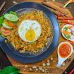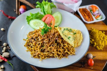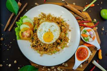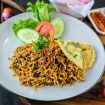 Fried noodle, fried egg, meatball, cabbage, carrot, caisim