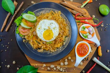 Fried rice noodle, fried egg, meatball, cabbage, carrot, caisim