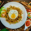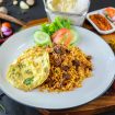 Fried rice, shrimp, calamari,fish, mushroom,,fried egg, tom yum paste