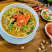 Chicken, rice noodle, boiled egg, bean sprout, cabbage, leek, celery, emping